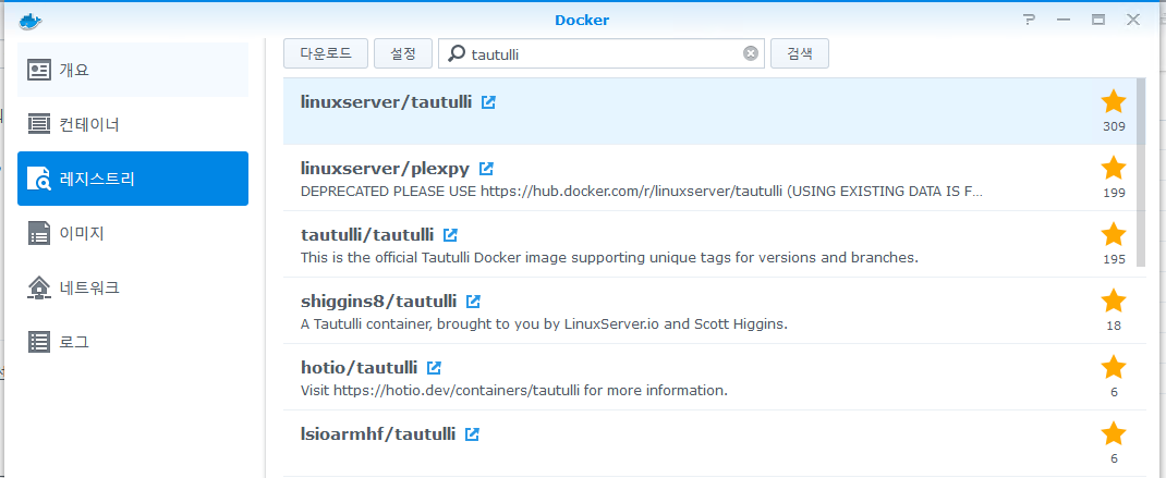 시놀로지의 Docker 화면 2. 레지스트리 메뉴에서 업데이트할 도커 이미지를 찾는다.